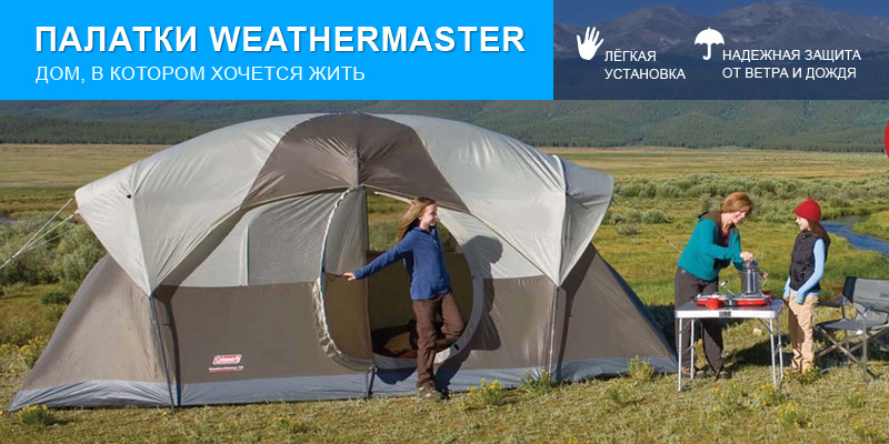 Для любителей активного отдыха. Палатки WeatherMaster легкие, удобные, воздухопроницаемые, предназначенные для комфортного проживания. Всесезонные палатки сделаны из специального материала, который защитит вас от дождя.