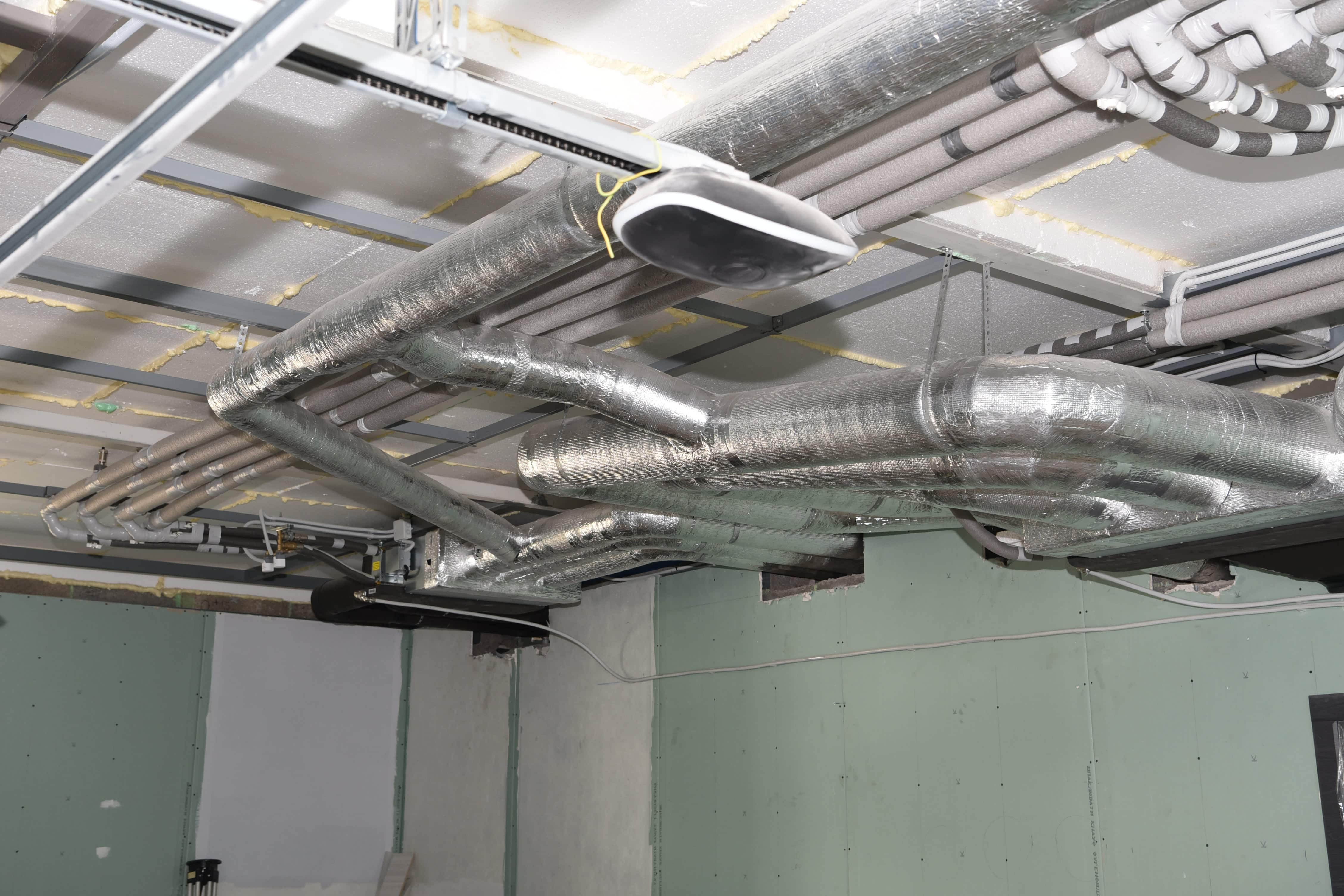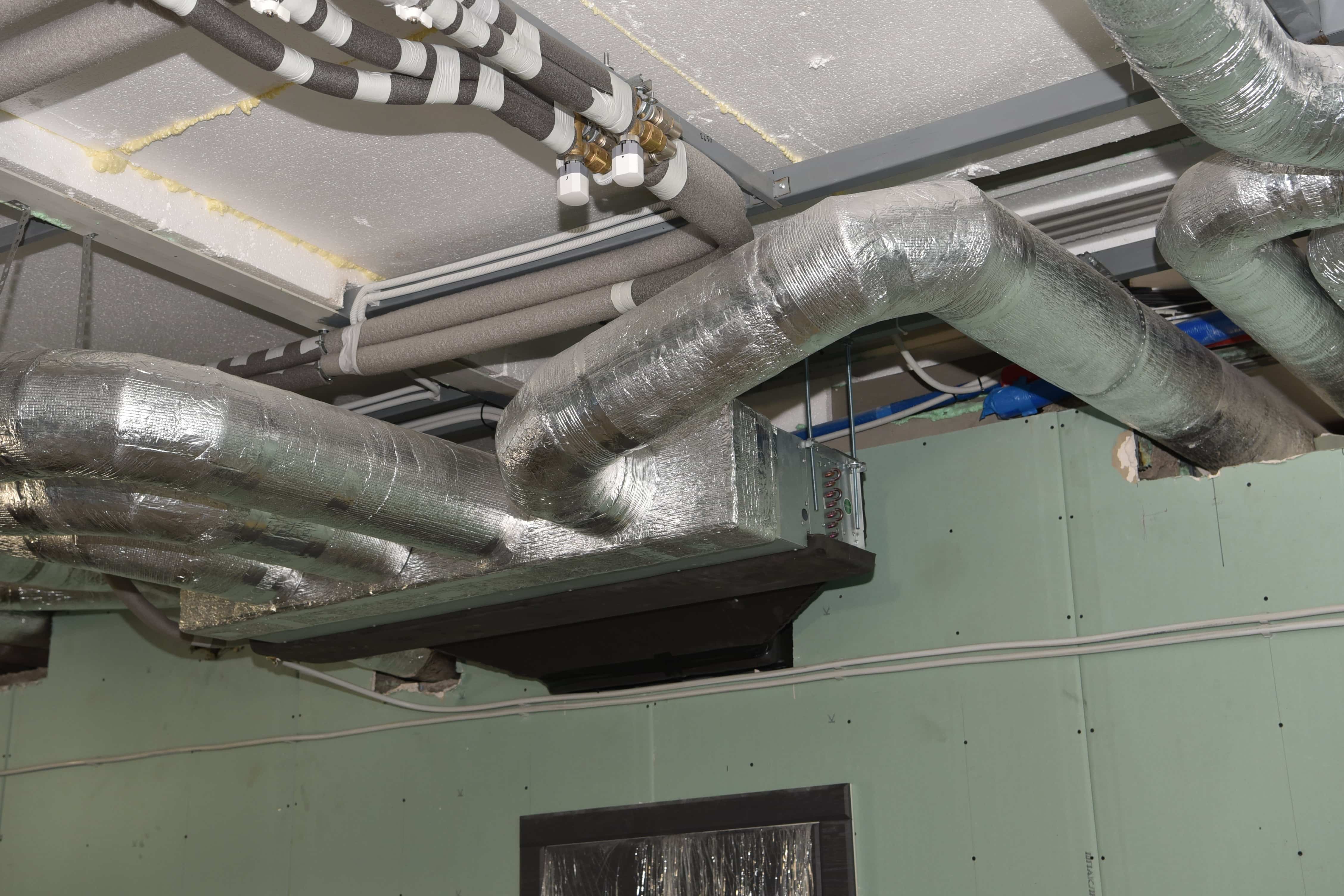 Изначально монтажники намечают и готовят места крепления воздуховодов (могут быть оцинкованные, алюминиевые, пластиковые, стеклотканные или из других материалов). Если на пути воздуховодов есть преграды в виде стен и перегородок, проделываются отверстия. Далее воздуховоды собираются в блоки с помощью различных соединений: