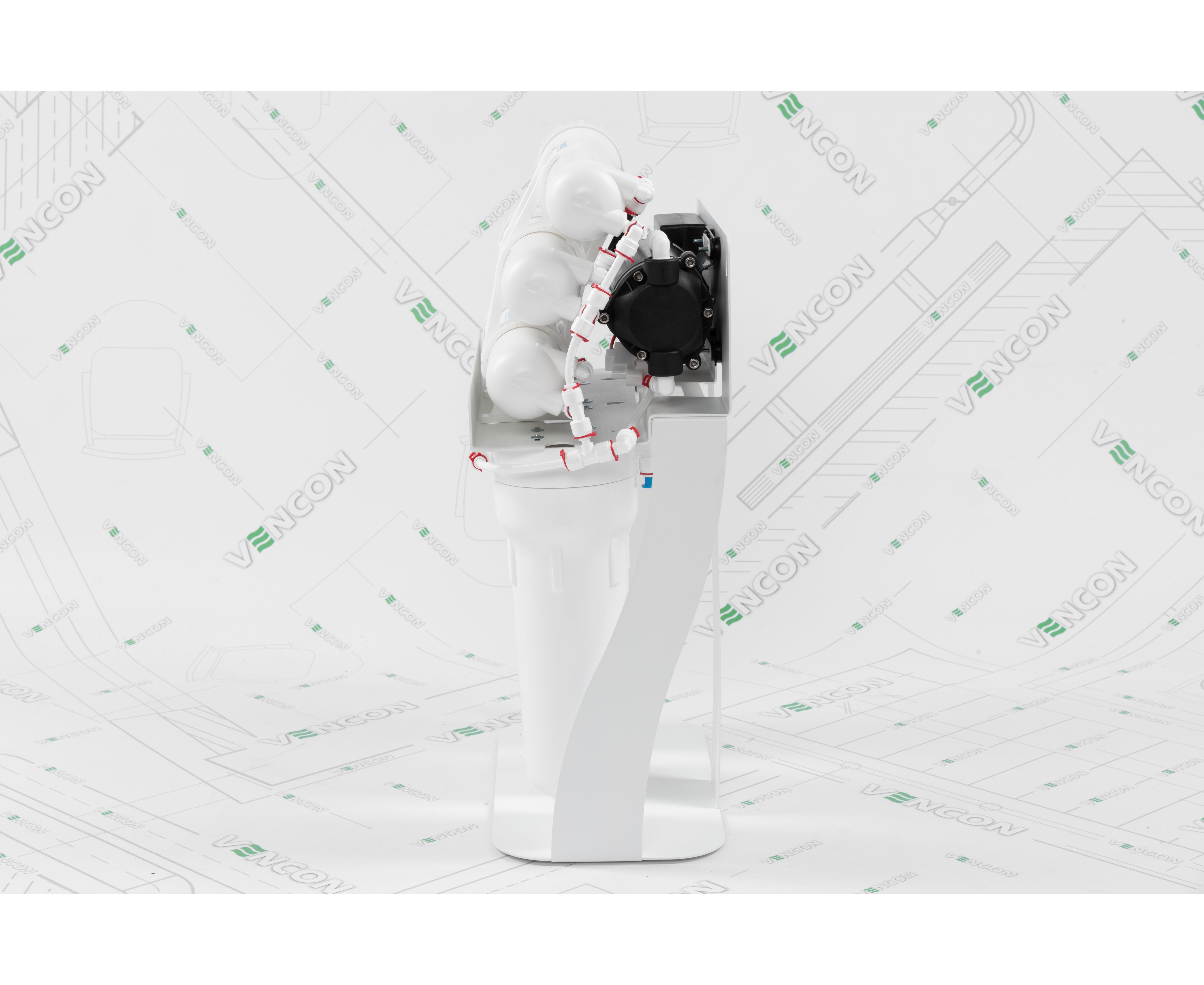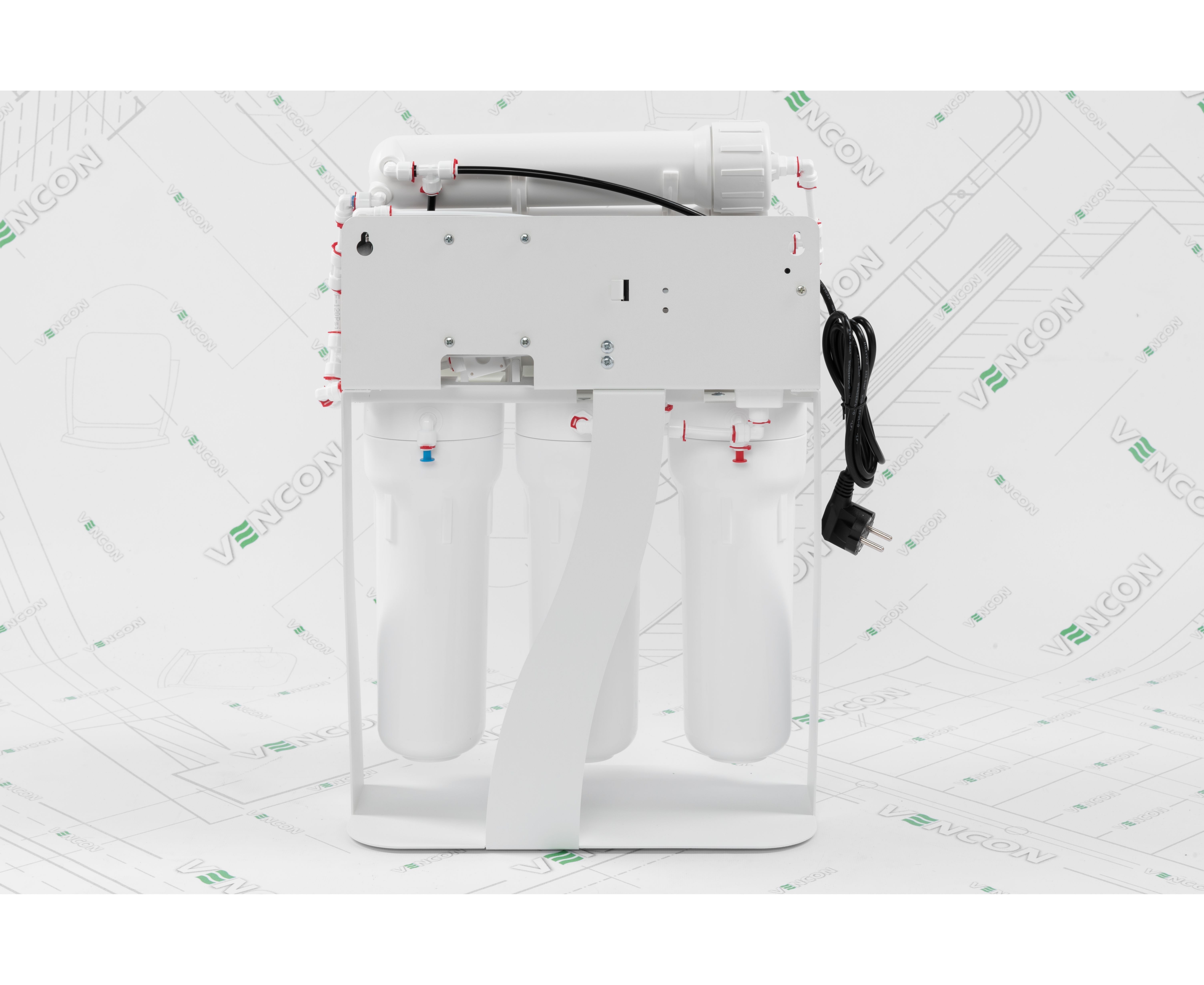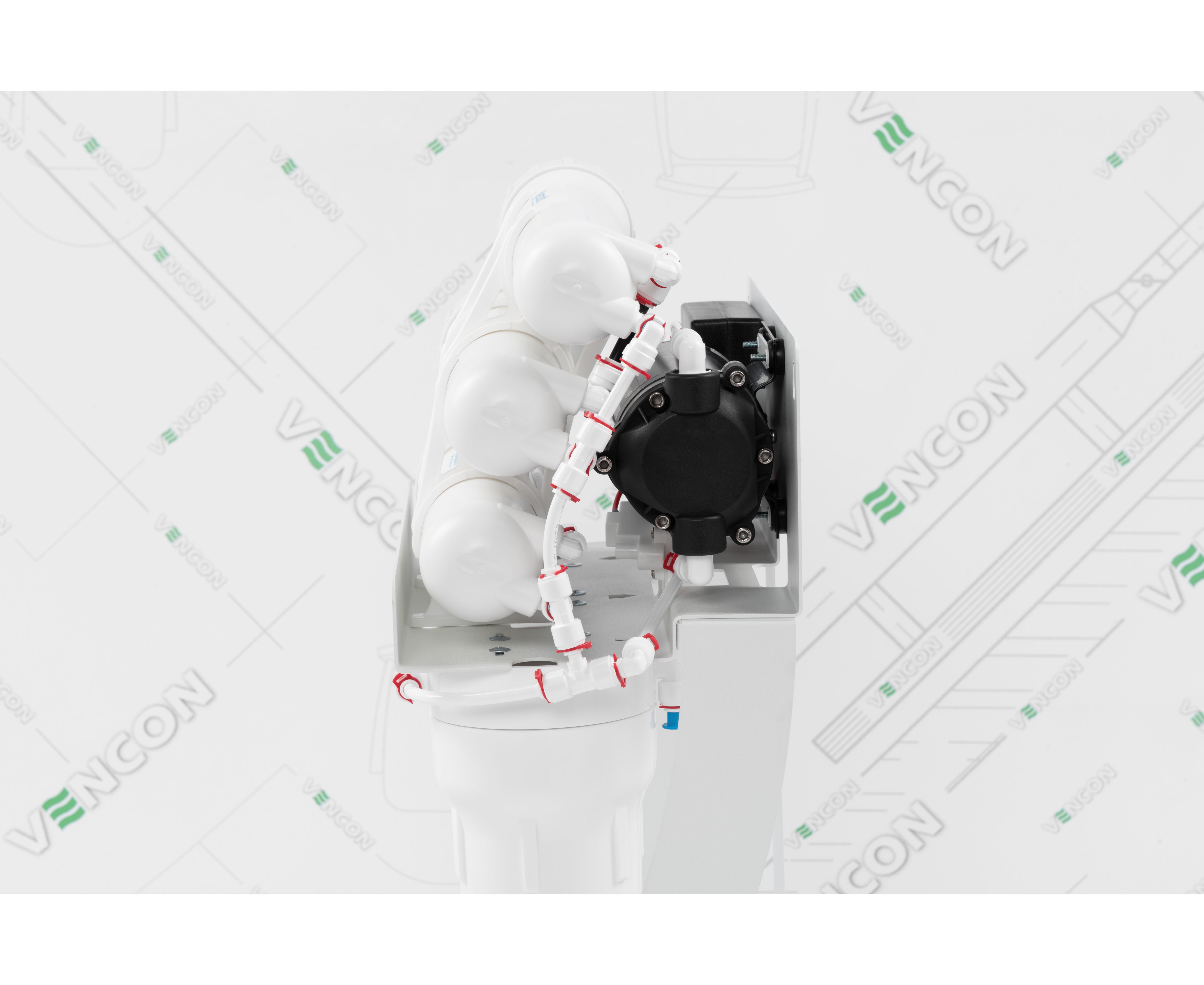 Данный фильтр оснащен обратноосмотической мембраной, насосом, помпой, краном для питьевой воды, ключами для колб и мембраны, встроенным манометром давления. Функционал включает 4-ступенчатую очистку воды до состояния питьевой, не требующей кипячения.