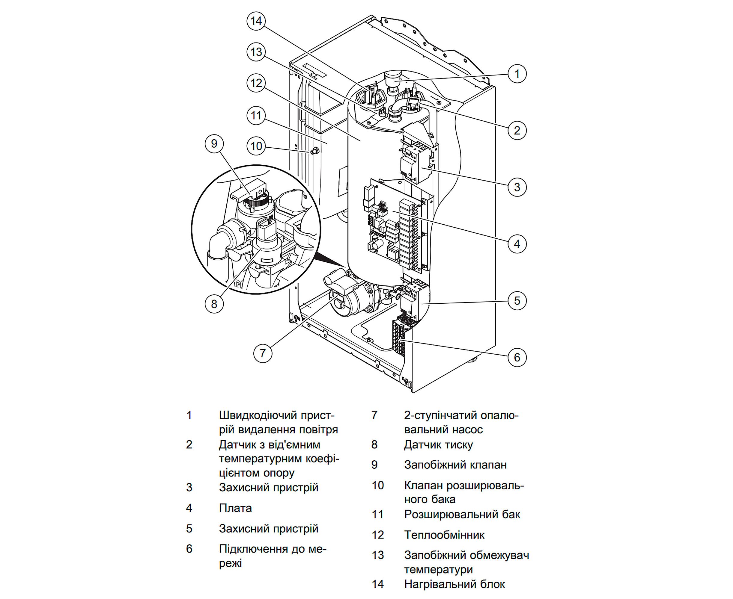Теплообменник представлен цилиндрическим резервуаром, который изготовлен из прочной износостойкой стали, дополнительно обработанной антикоррозийным покрытием. Нагревательный блок включает два ТЭНа. Показатели мощности ТЭНов возможно регулировать для экономии и щадящей работы отопительного аппарата. Кроме того равномерное распределение напряжения способствует безопасной работе, устойчивой скачкам в сети. В комплектацию входит расширительный бак, насос, аварийный термостат, датчик давления, а также предохранительный клапан.