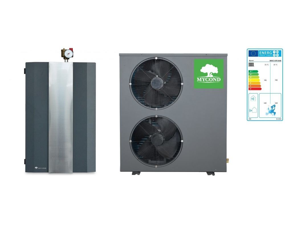 Тепловой насос Mycond Basic, классическое исполнение (сплит). Модель MHCS 070 AHB. Представляет собой трехфазный тепловой насос «Воздух-Вода» на 20 кВт, который состоит из: