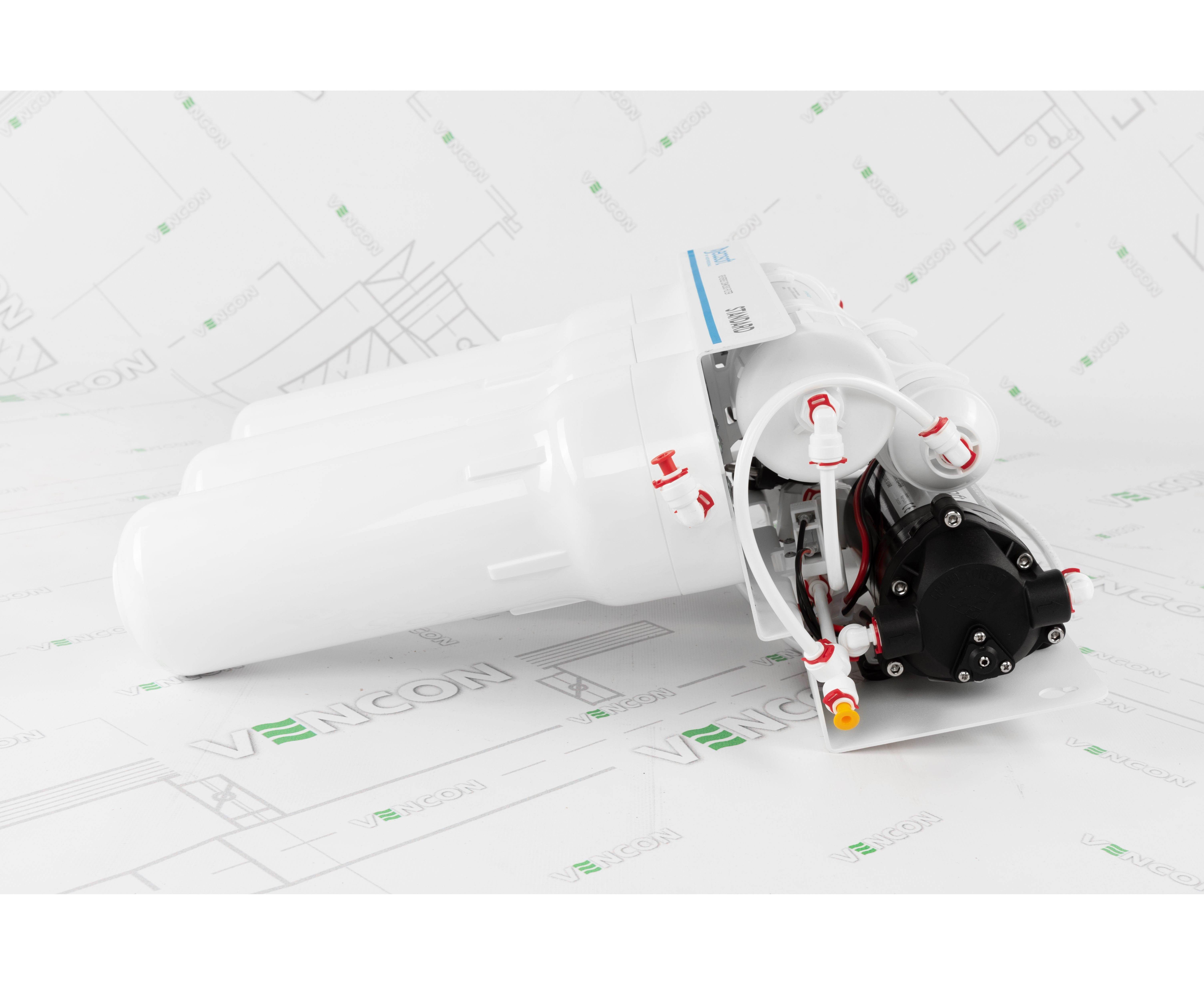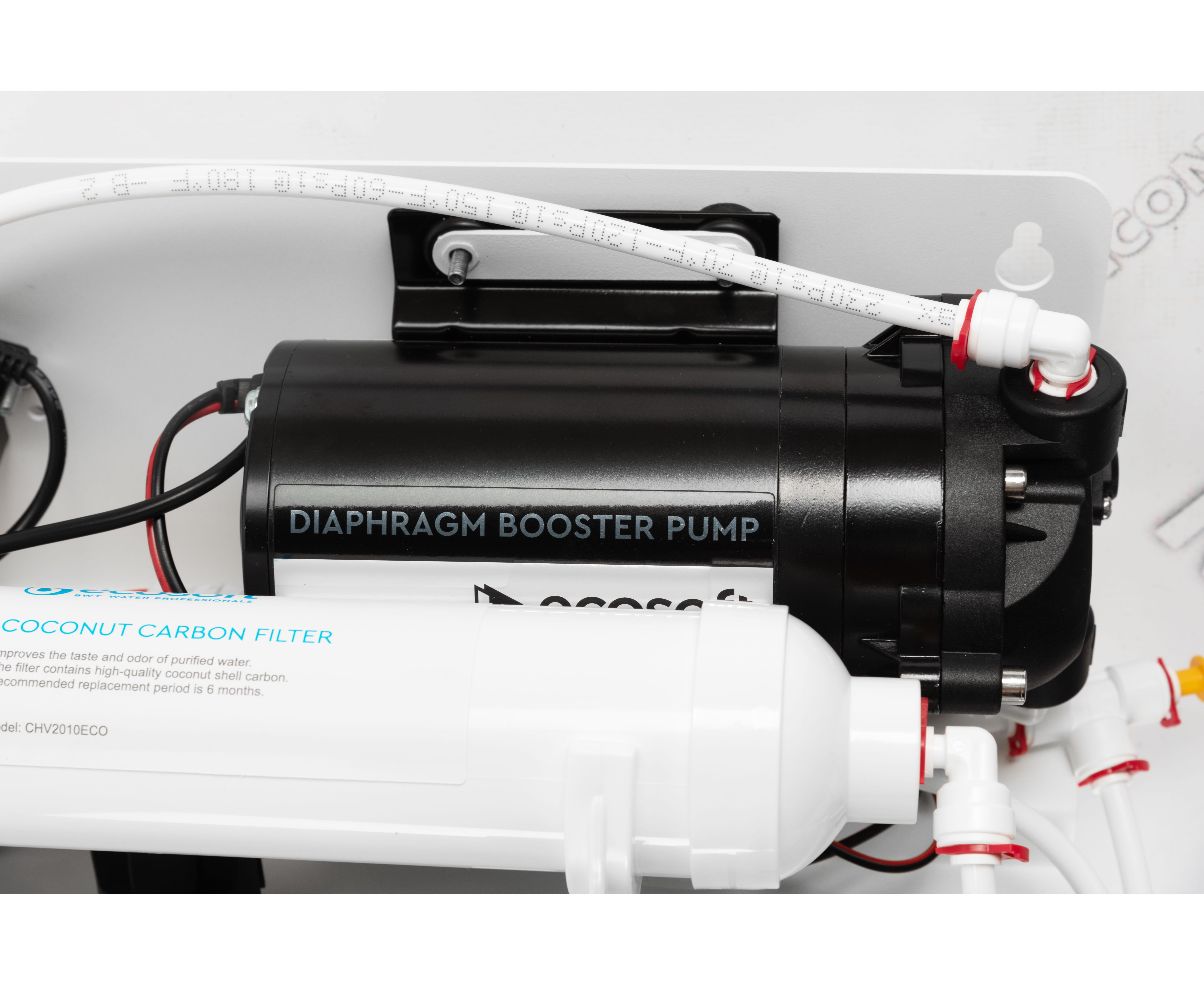 Блок зібраний на металевому кронштейні, поруч з ним закріплена помпа. При нестачі тиску в системі, насос або помпа починає свою роботу для правильного проходження води всього циклу очищення.