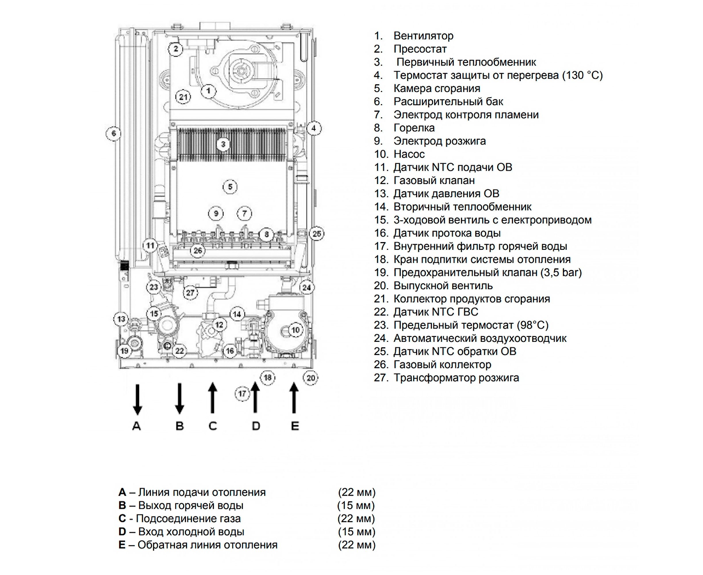 Нагрівання води відбувається в теплообміннику з нержавіючої сталі і контролюється на виході з вторинного обмінника датчиком температури. Пристрій передбачає безліч функцій, які при невеликій витраті газу дозволяють досягати ККД рівну 93%.