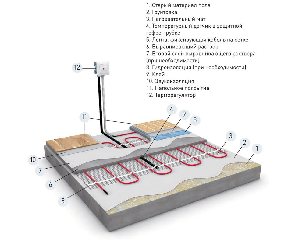 гарантійний талон, гофрована труба для установки датчика температури, монтажна ліпка стрічка, нагрівальний кабель, інструкція