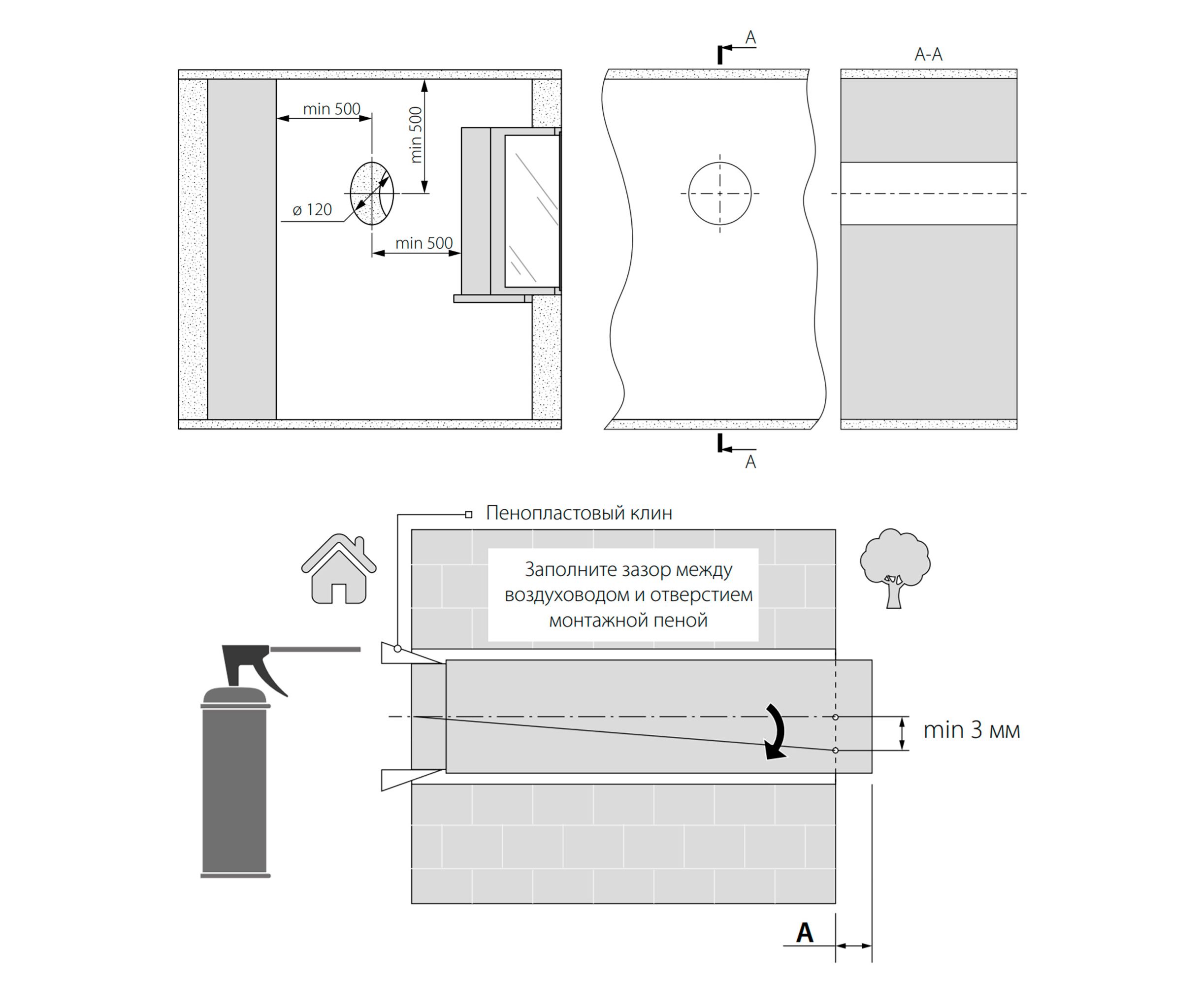 Докладні правила монтажу рекуператора описані в інструкції з експлуатації приладу. Якщо установка проводиться по готовому ремонту, то залишиться технологічний отвір.