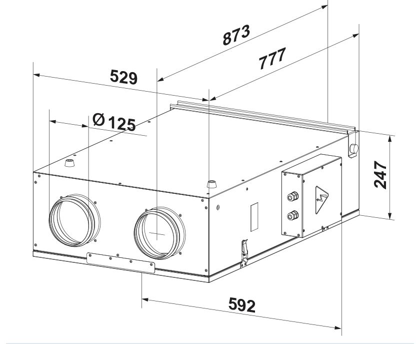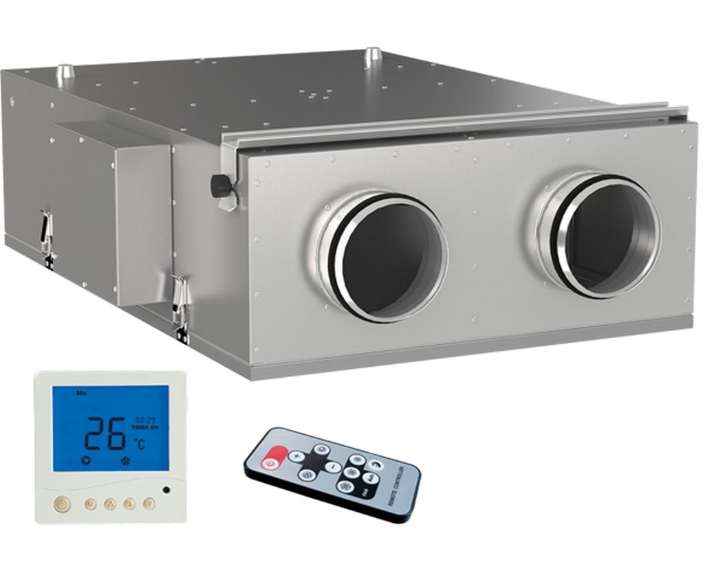 Підвісна приточно-витяжна установка в тепло- і звукоізольованому корпусі з горизонтальним напрямком патрубків. Продуктивність до 170 м3/год, ефективність рекуперації до 87%.