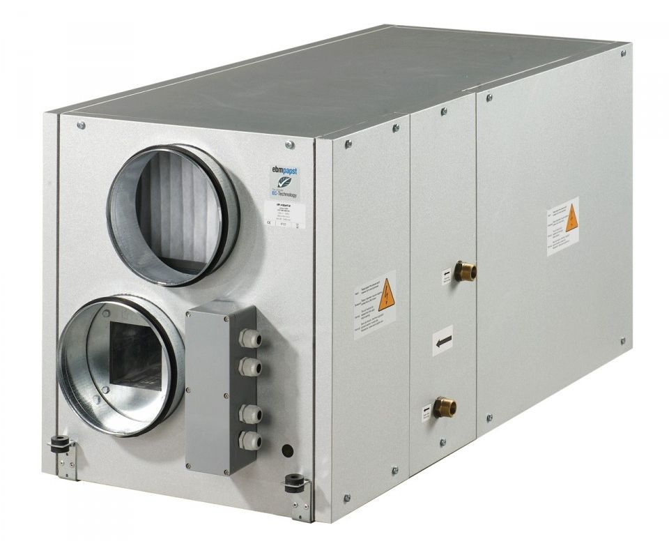 Припливно-витяжні установки ВУТ ВГ ЄС з водяним нагрівачем є повністю готові вентиляційні агрегати, що забезпечують фільтрацію і подачу свіжого повітря в приміщення і видалення забрудненого. При цьому тепло витяжного повітря передається припливному повітрю через пластинчастий рекуператор. Застосовуються в системах вентиляції і кондиціонування приміщень різного призначення, які потребують економічного рішення і керованої системи вентиляції. Застосування ЄС-моторів дозволило зменшити споживання електроенергії в 1,5-3 рази і при цьому забезпечити високу продуктивність і низький рівень шуму. Призначені для з'єднання з круглими повітроводами номінальним діаметром 150, 160, 200 мм.