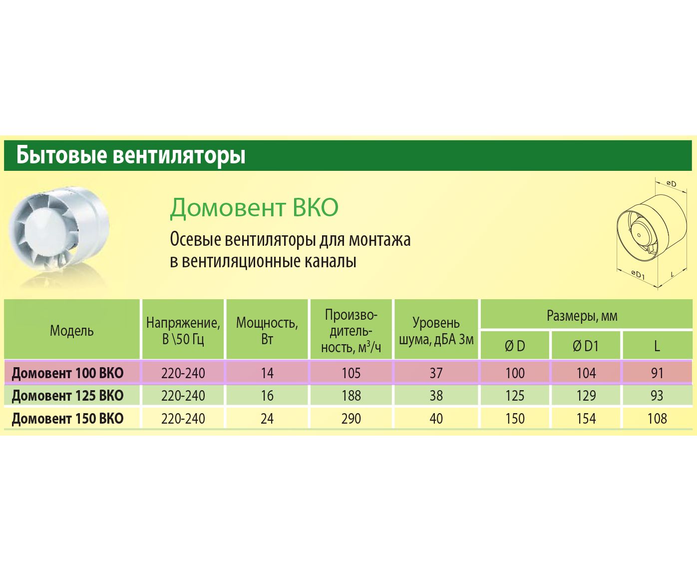 - Вдосконалена форма крильчатки вентилятора дозволила зробити його більш аеродинамічним і продовжити термін служби двигуна. Домовент 100 ВКО має рівень шуму 37 Дб. Для порівняння, звичайна розмова людини - 40 Дб.