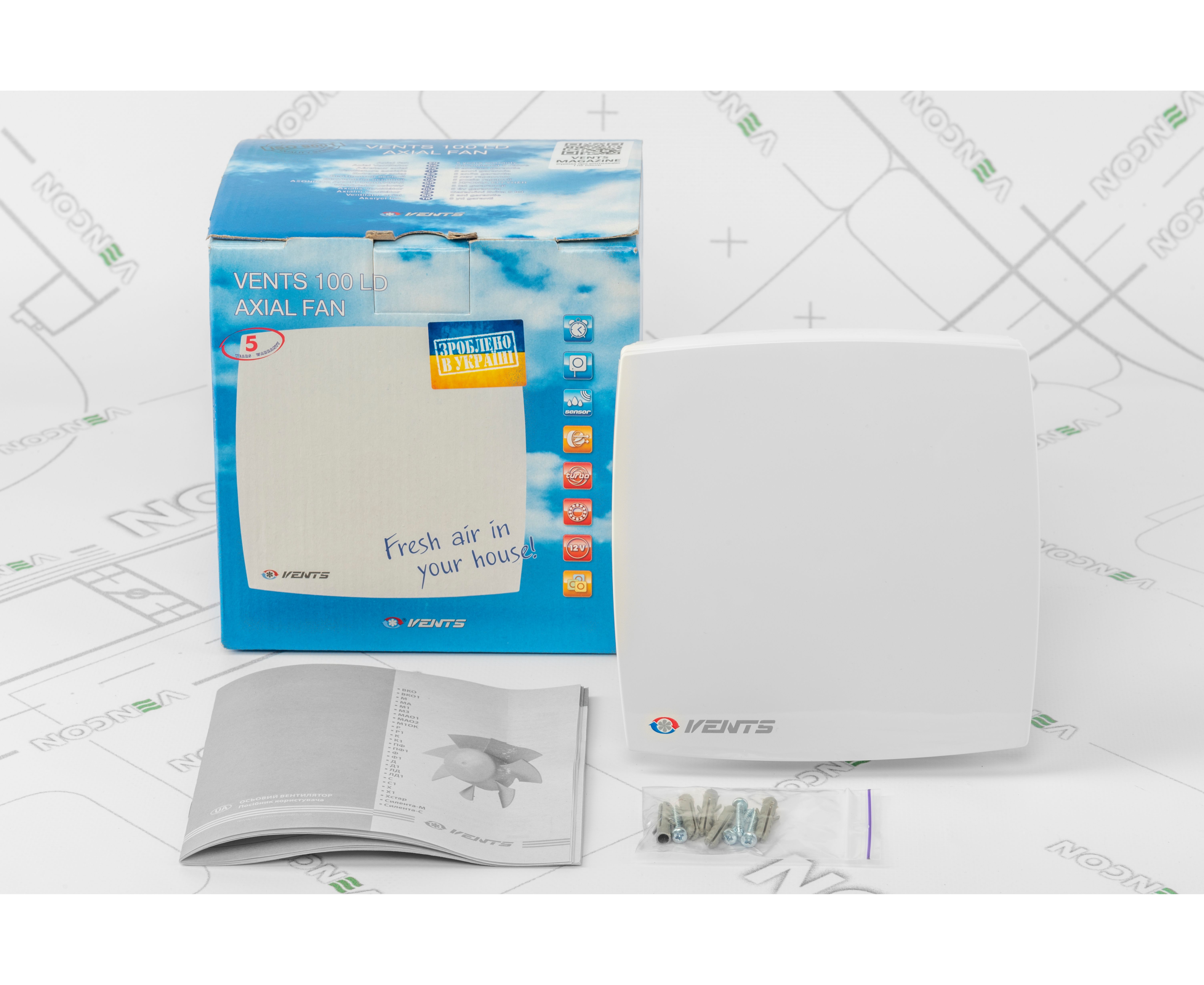 Вентилятор кріпиться безпосередньо в отвір вентиляційного каналу шурупами. При віддаленості вентшахт використовуються гнучкі повітроводи, які приєднуються хомутами. Можливий як настінний, так і стельовий монтаж. Ціна Вентс 100 ЛД відповідає високому стандарту якості і можливостям приладу.