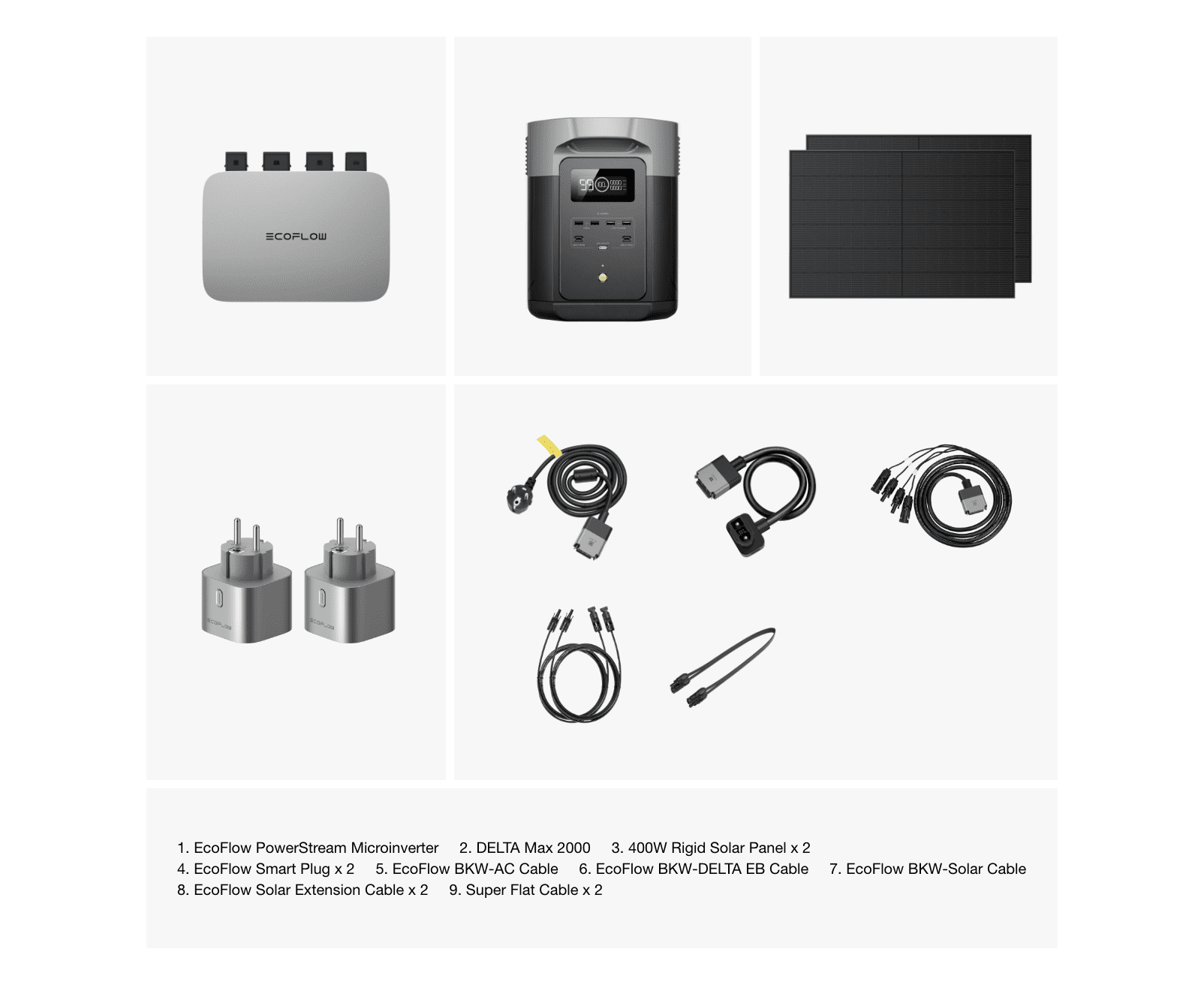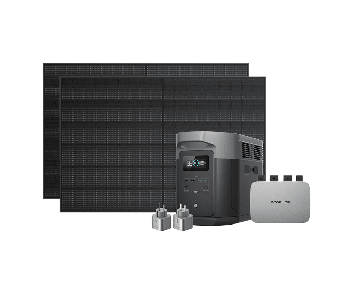 Комплект складаэться з мікроінвертора EcoFlow PowerStream на 600W, зарядної станції Delta Max 2000, та двох сонячних панелей по 400W