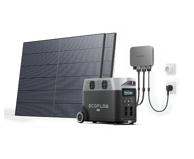 Комплект складаэться з мікроінвертора EcoFlow PowerStream на 800W, зарядної станції Delta Pro, та двох сонячних панелей по 400W
