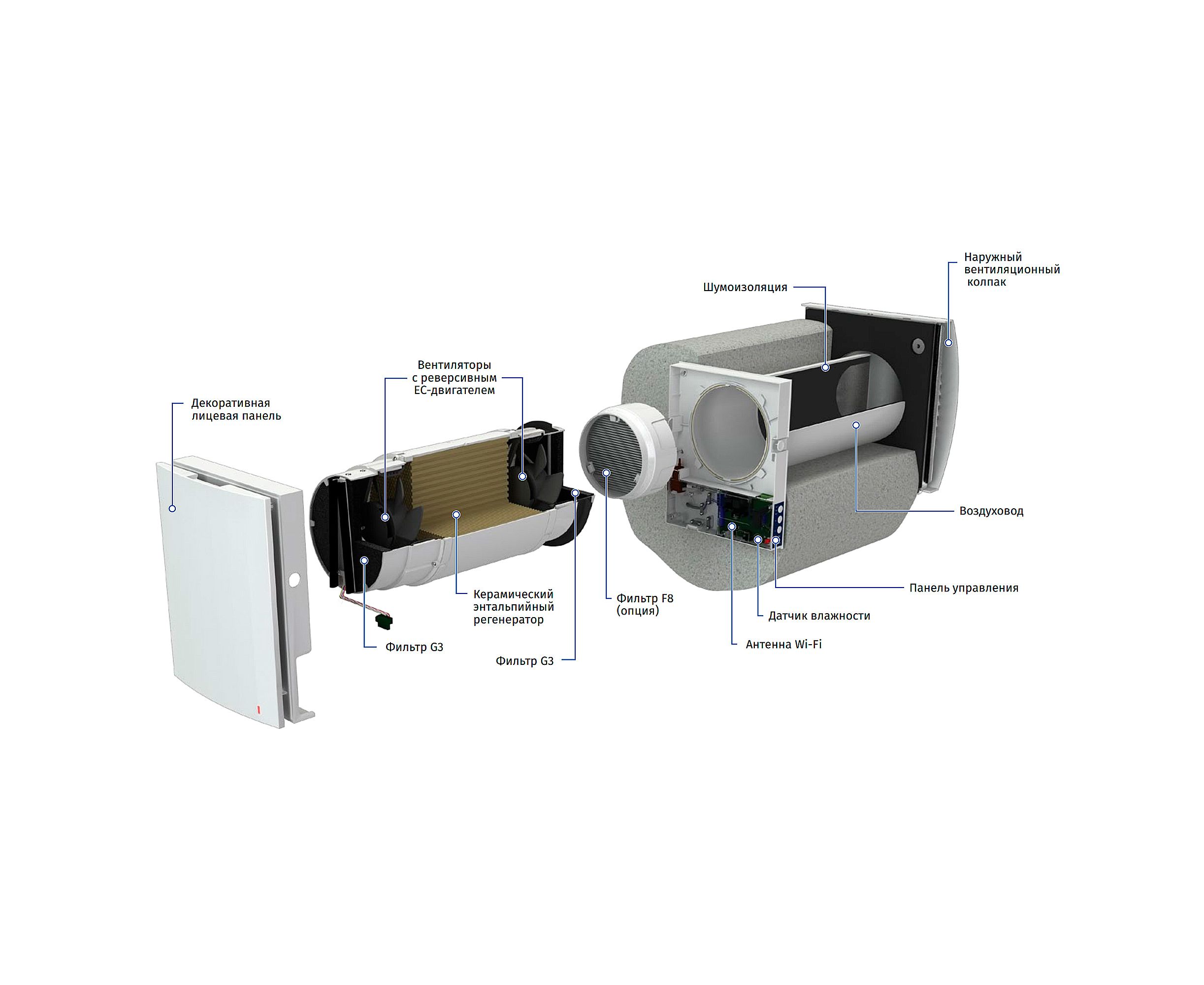 - Опционально рекуператор можно дополнить датчиками влажности и углекислого газа, фильтром класса F8 (минимизирует количество аллергенов, бактерий).