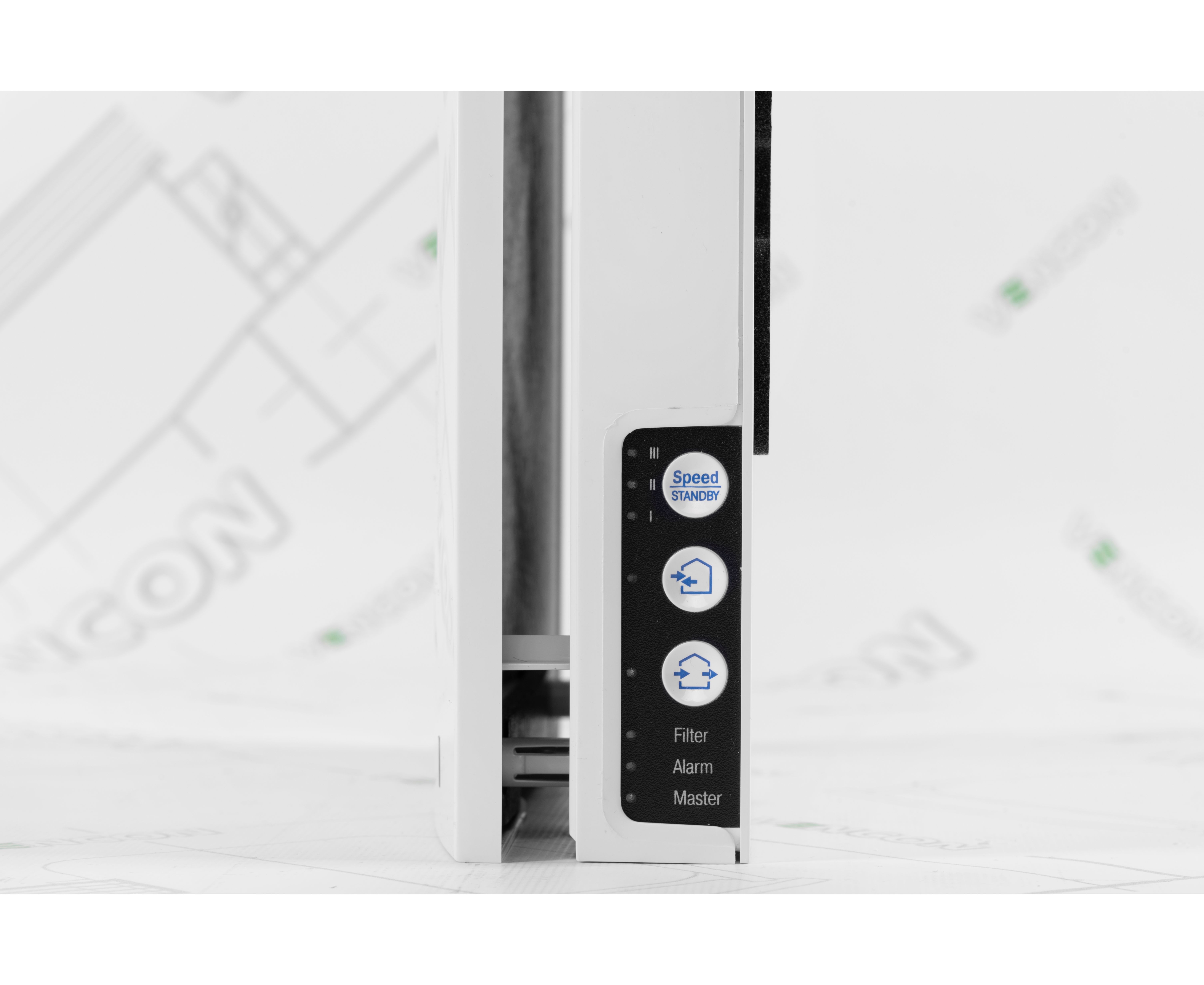 Кроме сенсорных элементов управления скоростью и режимами, на внутреннем блоке рекуператора есть также индикаторы: